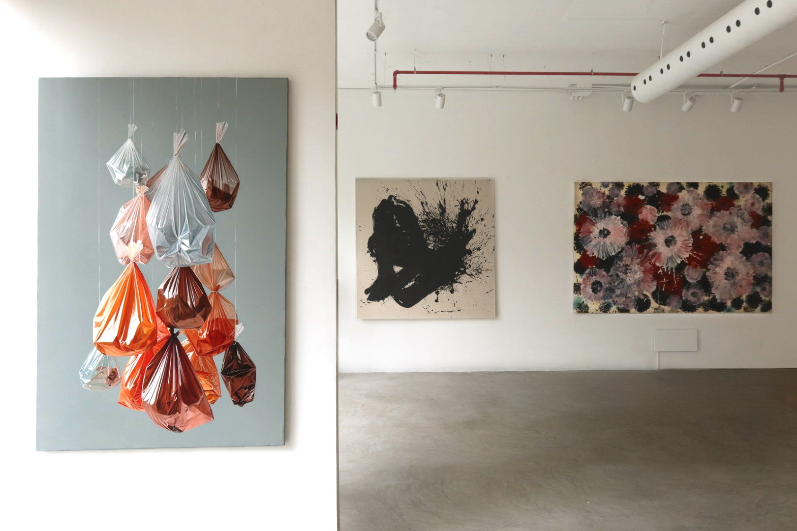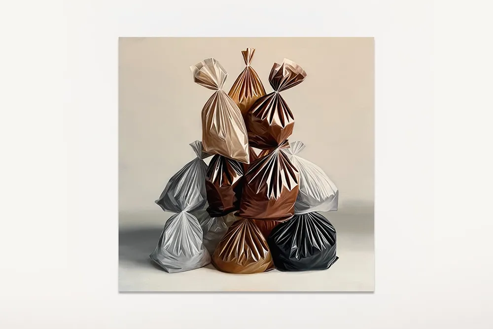“Pesos Livianos” propone un diálogo entre lo efímero y lo perdurable, lo que no retorna y lo trascendental. A través de composiciones hechas con bolsas plásticas suspendidas, esta exposición transforma un objeto cotidiano y banal en un elemento cargado de simbolismo, reinterpretado a través de un acto cotidiano y profundamente arraigado en la creencia popular. Esta práctica, llena de simbolismo, se convierte en el punto de partida para un diálogo entre lo doméstico, lo cultural y lo ambiental. Villabon permanece en su exploración poética y crítica de las imágenes que moldean nuestra identidad y memoria colectiva; despliega fragmentos de infancia, cultura, historia del arte e imágenes familiares.