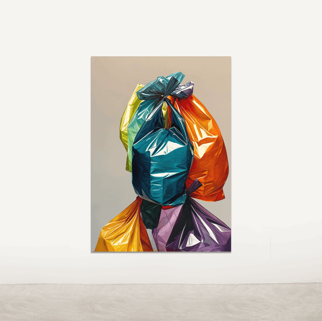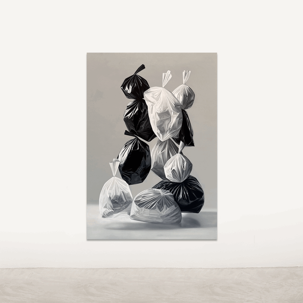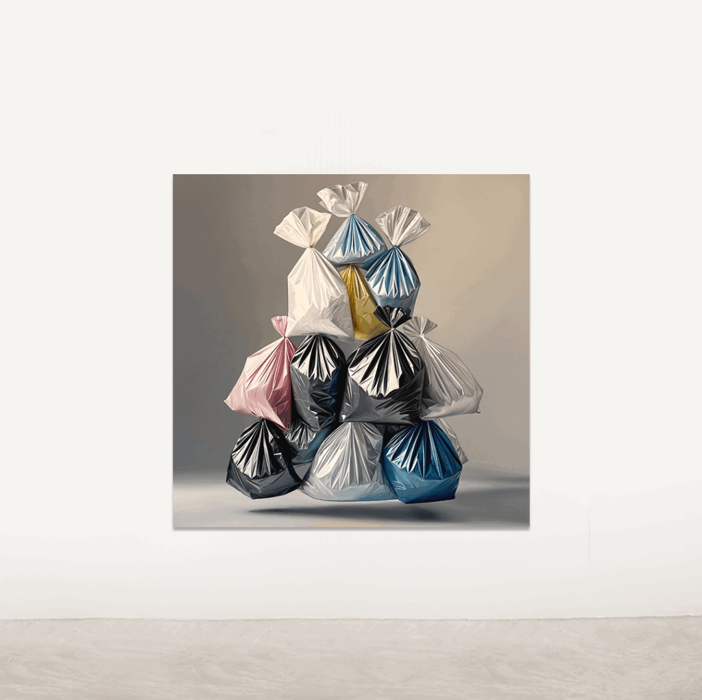 Villabón nos invita a mirar de cerca las texturas y la forma en que la luz pasa a través de las bolsas, mientras reflexionamos sobre el impacto de nuestras acciones y el valor real de lo que consideramos «desechable».
