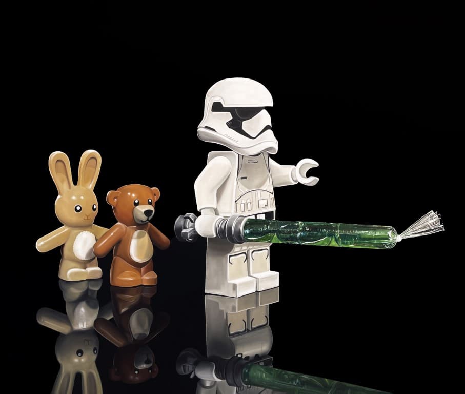 ADN (2022) surge de varias exploraciones formales que Villabon ha venido trabajando: la luz, la oscuridad, el color y la materialidad misma de las bolsas. Asimismo, proviene del análisis fotografíco de las películas y de la literatura universal, citadas en diferentes piezas. La sensibilidad del artista por ciertas imágenes populares da cuenta de pinturas excepcionalmente detalladas en las que evidenciamos mini figuras lego de personajes de Star Wars, Micky Mouse y Alicia en el país de las Maravillas; referentes comunes que llevan a pensar en el aspecto Pop de las obras. Sin embargo, las reflexiones de Villabón sobrepasan el juego de estas representaciones pictóricas cotidianas pues aluden al plástico como un arma silenciosa que afecta el medio ambiente, y por ende, nuestras vidas.